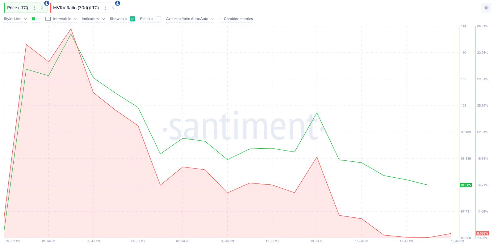 This view is validated by the MVRV ratio, which gauges the online monetary place of present LTC holders. The chart under reveals that almost all of buyers that purchased Litecoin within the final 30 days are holding 8% income